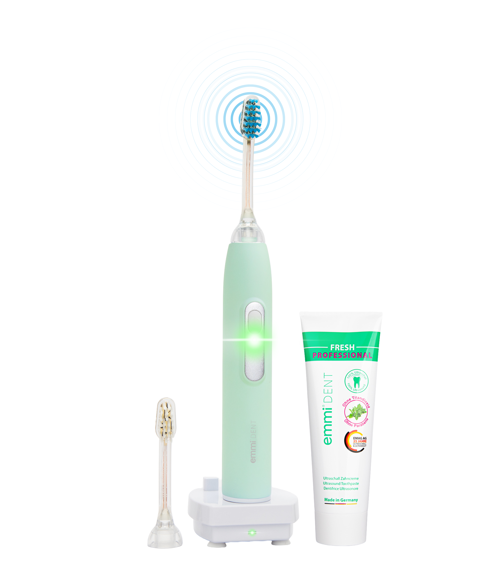 Die Ultraschallwellen dringen tief in die Zahnzwischenräume und den Zahnfleischrand ein. Dort lösen sie Bakterien und Plaque auf, was Karies, Zahnfleischentzündungen und andere Zahnerkrankungen effektiv vorbeugt. Für besonders gründliche Ergebnisse wird die speziell entwickelte emmi-dent Ultraschall-Zahnpasta verwendet. Die beigefügten Mirkobläschen unterstützen die Wirkung des Ultraschalls um ein Vielfaches.