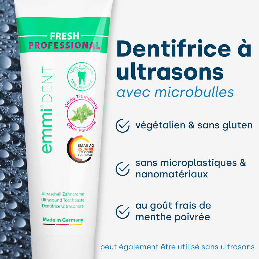 Les ondes ultrasonores pénètrent profondément dans les espaces entre les dents et la gencive. Ils y dissolvent les bactéries et la plaque dentaire, ce qui prévient efficacement la carie dentaire, la gingivite et d’autres maladies dentaires. Pour des résultats particulièrement approfondis, le dentifrice à ultrasons emmi-dent spécialement développé est utilisé. Les microbulles incluses renforcent considérablement l'effet des ultrasons.