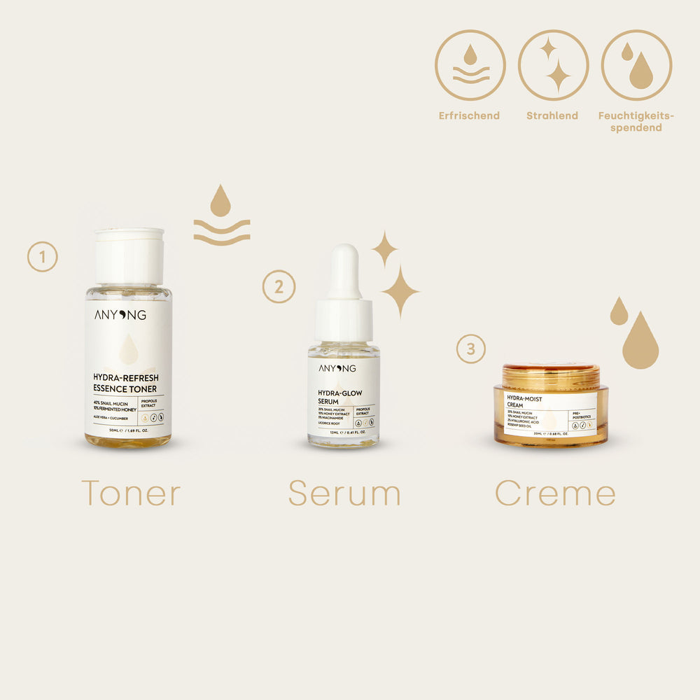 Das perfekte Kit für deinen unverwechselbaren Glow. Der sanfte Toner mit Honig und Aloe Vera Extrakten versorgt deine Haut mit Feuchtigkeit und Vitaminen und sorgt damit für ein ideales Vorspiel. Der Höhepunkt deines Glows ist das leichteinziehende, tiefenreinigende Serum. Der kuschelige Abschluss bildet die reichhaltige Hydra-Moist Creme als unverzichtbarer Begleiter.