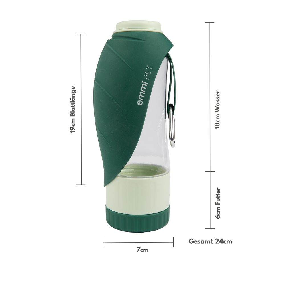 Bei Anstrengung oder Hitze brauchen Hunde besonders viel Wasser. Auf Reisen oder beim Spaziergang ist es manchmal nicht leicht, den Vierbeiner mit frischem Wasser zu versorgen. Unterwegs ist es dann nicht verwunderlich, wenn das Tier Durst bekommt und aus Pfützen oder Tümpeln trinkt. Doch das Wasser kann Krankheitskeime enthalten und zu Verdauungsproblemen führen. Deshalb ist die emmi-pet Hundetrinkflasche die ideale Lösung für unterwegs. Mit der emmi-pet Hundetrinkflasche 2in1 hast du immer reichlich Wasser parat. Durch einfaches Umklappen des Blattes verwandelt sich die Haustiertrinkflasche augenblicklich in eine praktische Wasserschüssel. Mit dem speziellen Druckdesign kannst du mühelos den Wasserfluss kontrollieren oder zurückfließen lassen. Der dazugehörige Futterbehälter bietet Platz für Leckerlies oder kleine Snacks. Unsere Hundetrinkflasche to go ist mit einem leicht zu tragenden Aluminiumkarabiner ausgestattet und kann problemlos an Tasche oder Fahrrad befestigt werden.