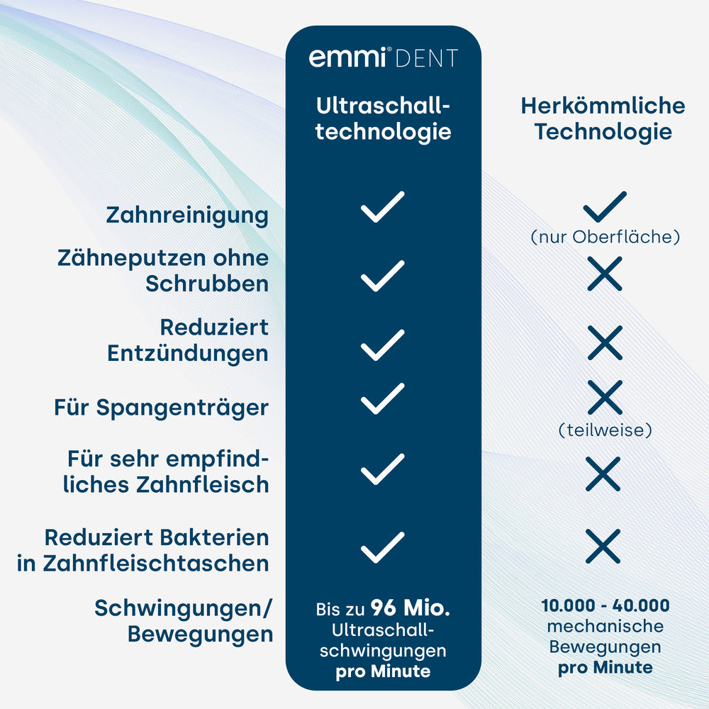 In der professionellen Zahnreinigung beim Zahnarzt hat sich die Ultraschalltechnik bewährt. Zum Einsatz kommt hierbei ein „harter“ Ultraschall, der eine geringe Frequenz bei hoher Leistung aufweist. Zahnärzte verwenden die Methode seit vielen Jahren erfolgreich zur Beseitigung von Zahnstein und anderen Verunreinigungen. Die Ultraschallzahnbürste ermöglicht auch zuhause den täglichen Einsatz der Ultraschalltechnologie. Die innovative emmi-dent verwendet einen „weichen“ Ultraschall mit hoher Frequenz und niedriger Leistung.
