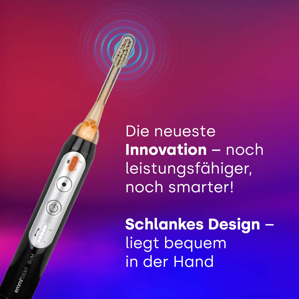 Die emmi-dent Slim setzt neue Maßstäbe in der Zahnpflege. Mit der fortschrittlichen Ultraschalltechnologie und ihrem schlanken Design sorgt sie für eine besonders gründliche und sanfte Reinigung von Zähnen und Zahnfleisch – ganz ohne mechanische Bewegungen.