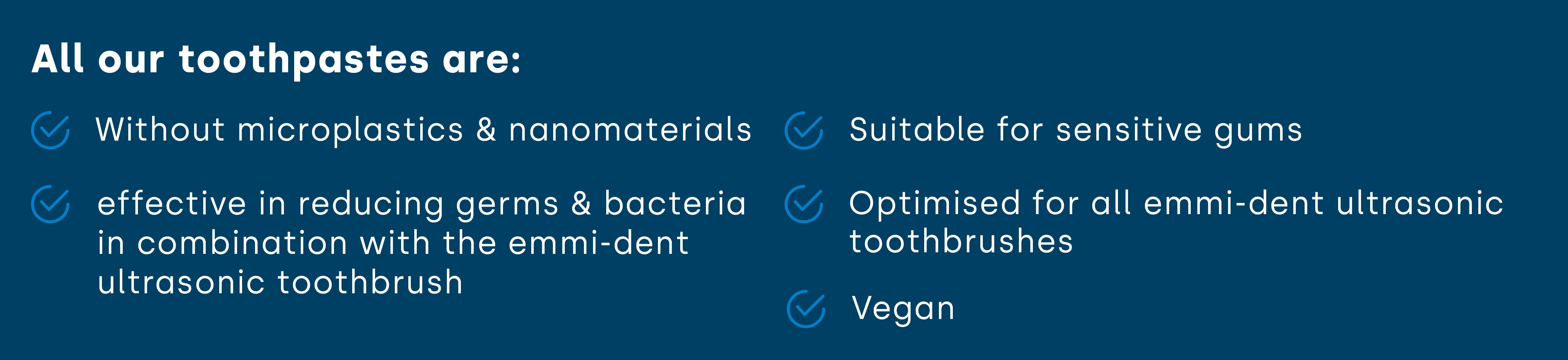 The combination of emmi-dent Toothpaste with the emmi-dent Ultrasonic toothbrushes therefore offer an advanced and effective method for daily dental care that can lead to improved oral hygiene and a healthier smile.