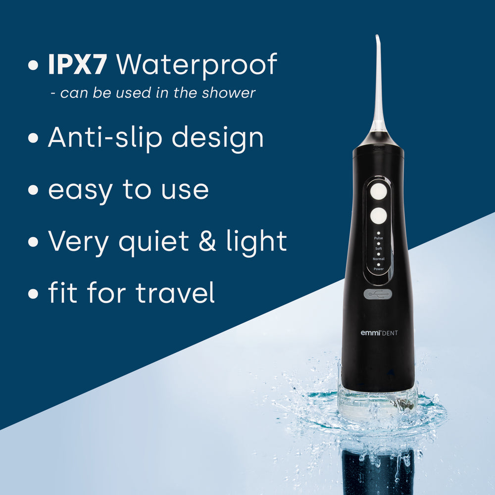 Oral irrigators are available in various designs, from models that are connected directly to the tap and thus restrict freedom of movement through a water hose, to stationary oral irrigators with an external water tank, which are also limited in their handling. emmi-dent has recognized these challenges and developed an innovative solution: a practical, uncomplicated and effective oral irrigator. The emmi-dent electric oral irrigator is characterized by its cordless design, which allows unrestricted mobility throughout the entire oral cavity. Equipped with a generous water tank and an integrated battery, it offers maximum handiness without annoying cables or hoses. Simply fill the tank with water and charge the battery - and the device is ready to go. In addition, the emmi-dent oral irrigator is the ideal companion when traveling due to its compact size. The advantages of the emmi-dent oral irrigator: - Cordless for unrestricted freedom of movement - Compact design, perfect for on the go - 300 ml water tank in the handpiece for easy refilling - Easy charging of the battery with USB-C (charge for 4 hours, use for 60 days) If you are looking for a product that fits seamlessly with your lifestyle and your demands for careful dental care, the emmi-dent oral irrigator offers a tailor-made solution. Developed for users who value thorough and relaxed oral hygiene both at the start of the day and at the end of the evening, it sets new standards in tooth cleaning.