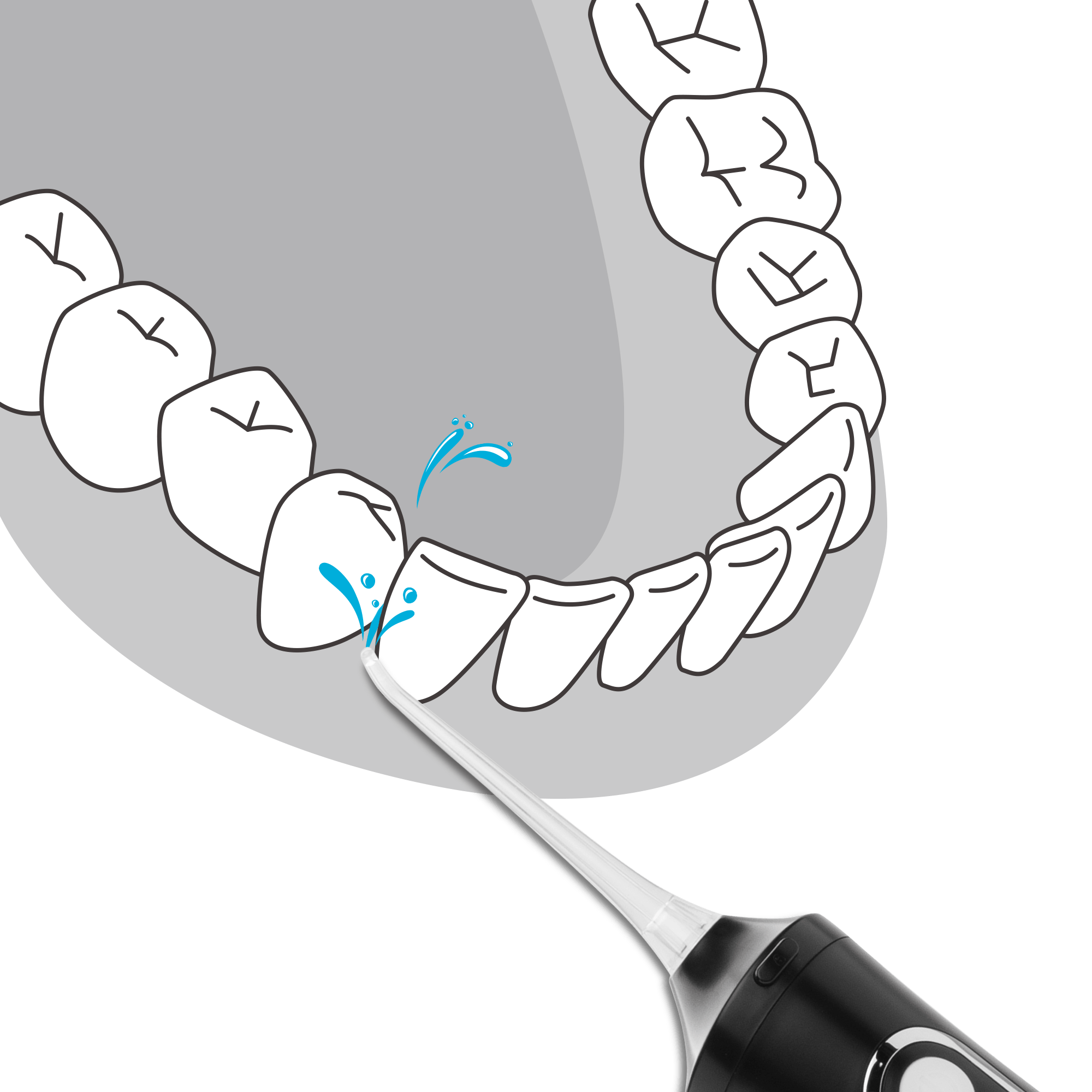 What exactly is an oral irrigator and how does it work? An oral irrigator is an electronic device that uses a targeted jet of water to remove loose particles between the teeth. Unlike dental floss, which can injure the gums if used incorrectly, an oral irrigator allows for gentle cleaning, even in sensitive areas that are difficult to reach. Using dental floss can also be unpleasant, while an oral irrigator is a simple and hygienic alternative. It is an ideal addition to daily oral care and helps effectively to remove deposits and thus prevent the formation of plaque.