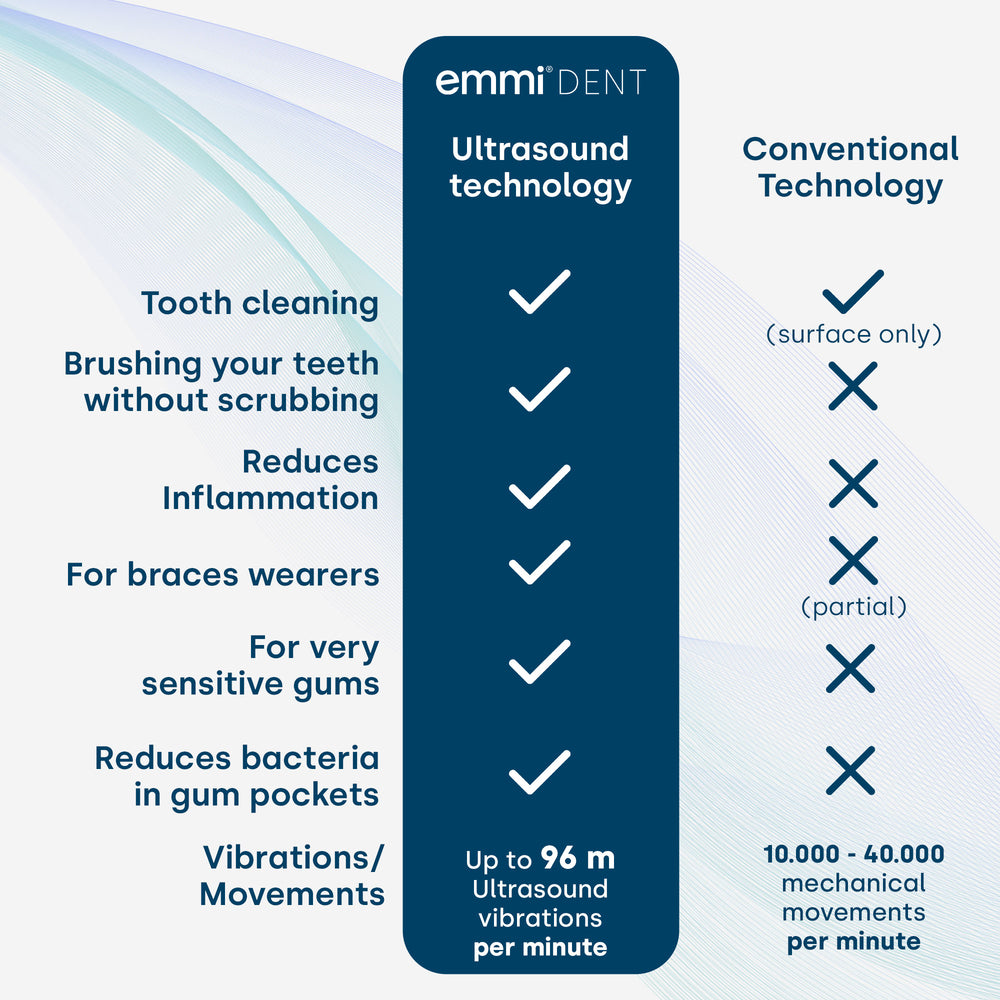 The ultrasonic technology of the emmi-dent Slim revolutionizes daily oral hygiene. With 96 million vibrations per minute, it generates ultrasonic waves that penetrate deep into the interdental spaces and gum pockets. These high-frequency vibrations effectively dissolve plaque and bacteria without damaging the sensitive tooth structure or gums. Unlike conventional electric toothbrushes, the emmi-dent Slim does not use mechanical movements. Instead, it uses the power of ultrasound to ensure a thorough yet gentle cleaning. This innovative method is particularly beneficial for people with sensitive gums, periodontitis, or periodontal pockets.