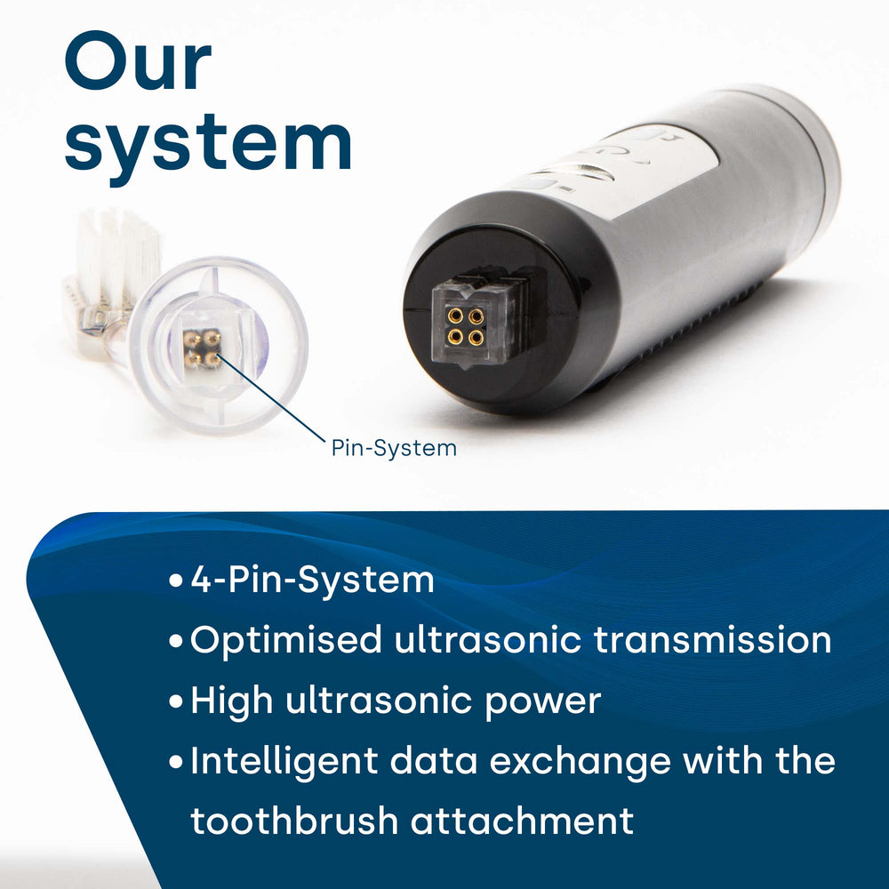 Another highlight is the intelligent 4-pin system, which ensures particularly efficient ultrasonic transmission and simultaneously enables smart communication between the toothbrush and brush head. This specifically optimizes cleaning performance.