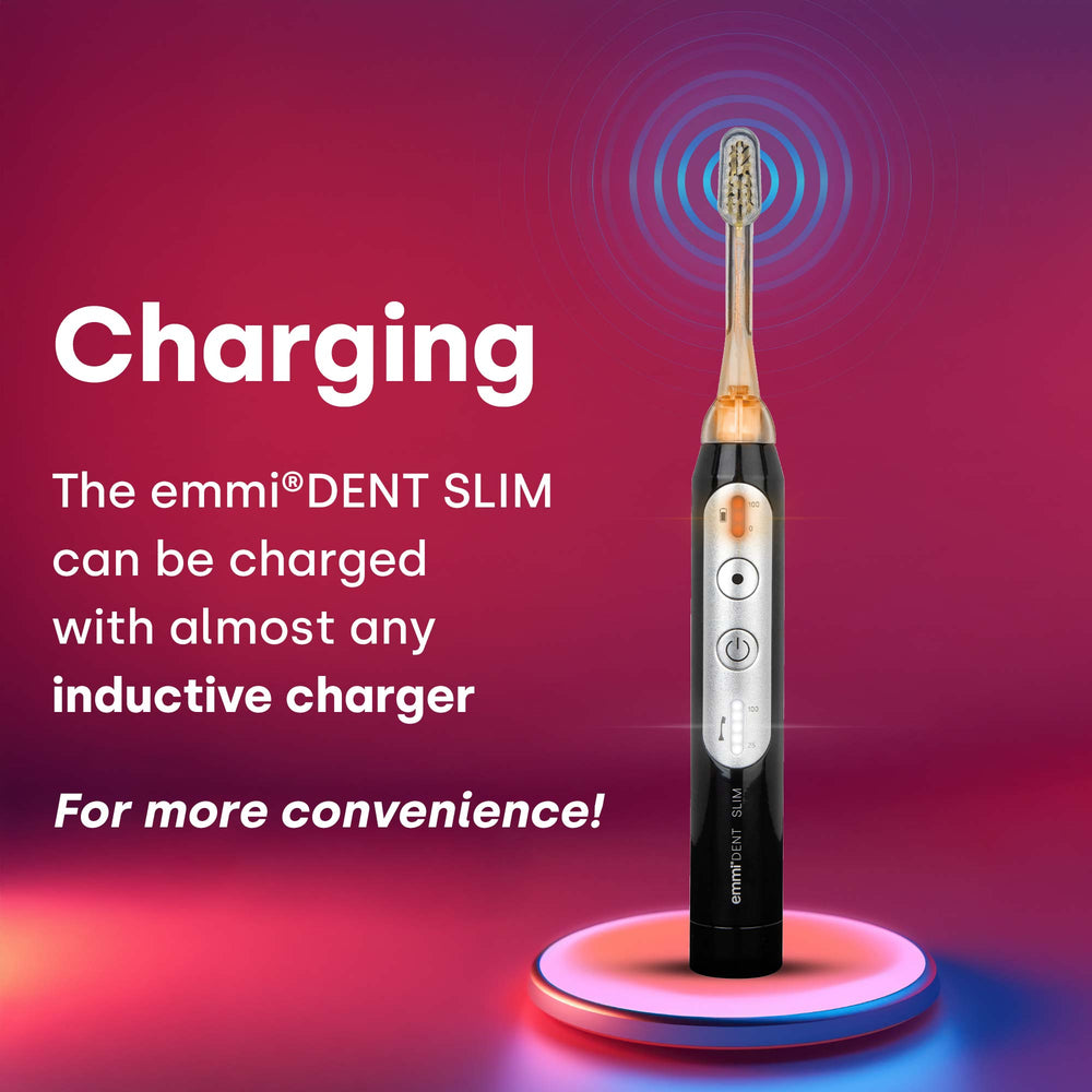 With an impressive battery life of up to 15 days when used twice a day, the emmi-dent Slim impresses, so frequent charging is no longer necessary. A practical battery charge indicator always shows you the current charging status, and thanks to compatibility with almost every inductive charger, charging is particularly straightforward.