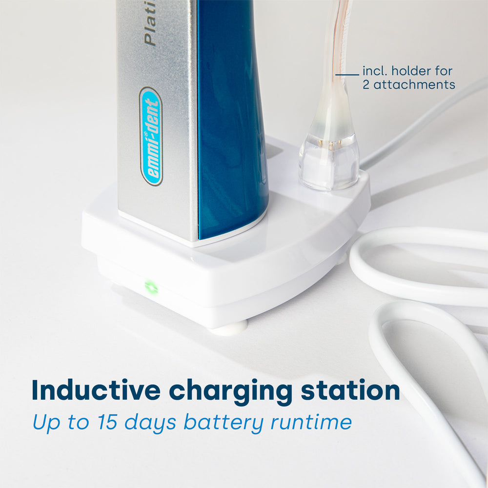 The emmi-dent Platinum has a longer battery life than its predecessor models. With regular use of 2-3 times a day, the Platinum can last up to 15 days before it needs to be recharged. This extended battery life (lithium-ion) offers convenience and uninterrupted use and eliminates the need for frequent charging.