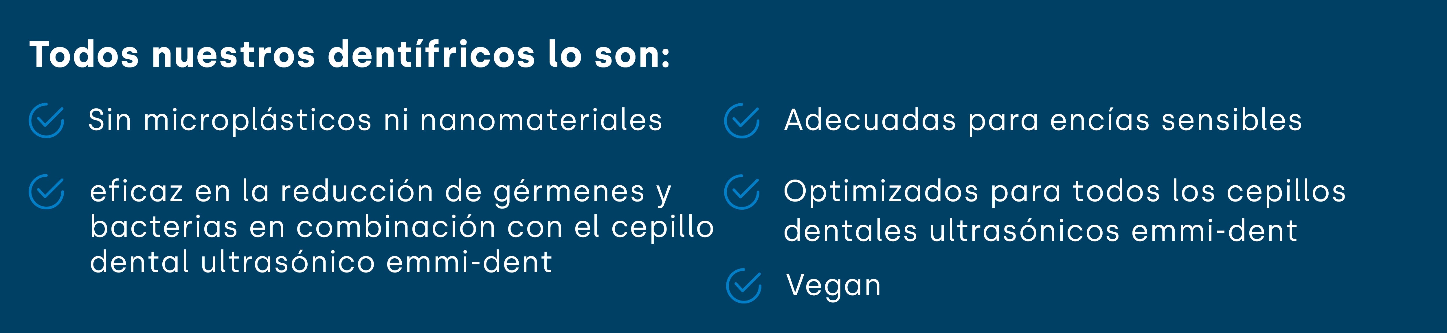 La combinación de la pasta de dientes ultrasónica con el cepillo de dientes ultrasónico emmi-dent ofrece un método eficaz e innovador de cuidado dental. A continuación se muestran algunas razones por las que resulta beneficioso utilizar pasta de dientes ultrasónica con el cepillo de dientes ultrasónico emmi-dent :