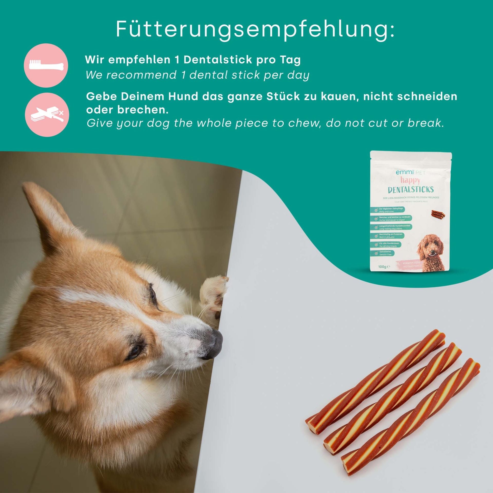 Los palitos pulidores de dientes emmi-pet ofrecen a los perros una combinación de cuidado dental fácil y disfrute. Con un delicioso aroma a pollo y piel de res, los palitos son irresistibles para tu amigo de cuatro patas. Al masticar, el palito garantiza una limpieza profunda de los dientes y ayuda a reducir la placa y el sarro, para un aliento fresco y unos dientes sanos.