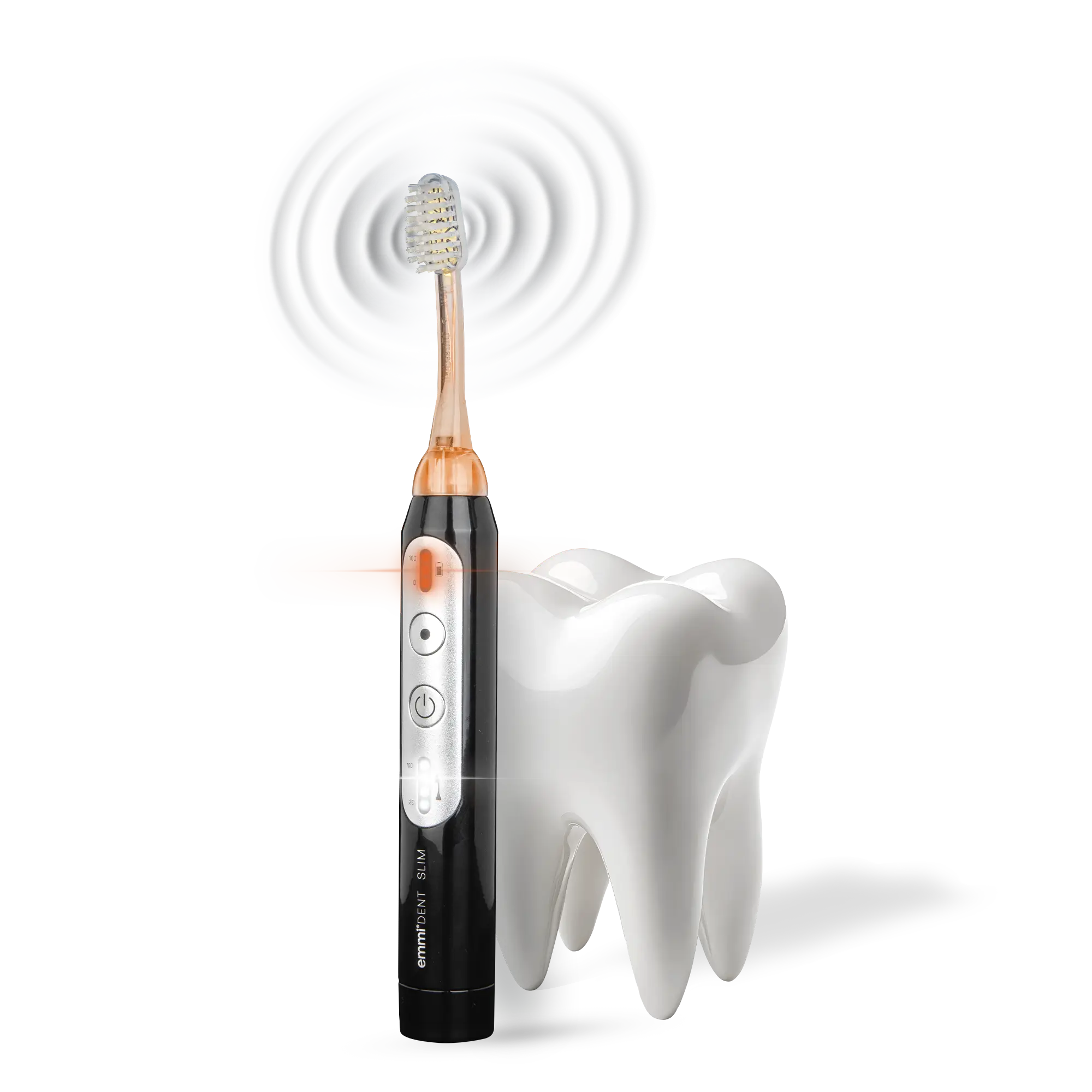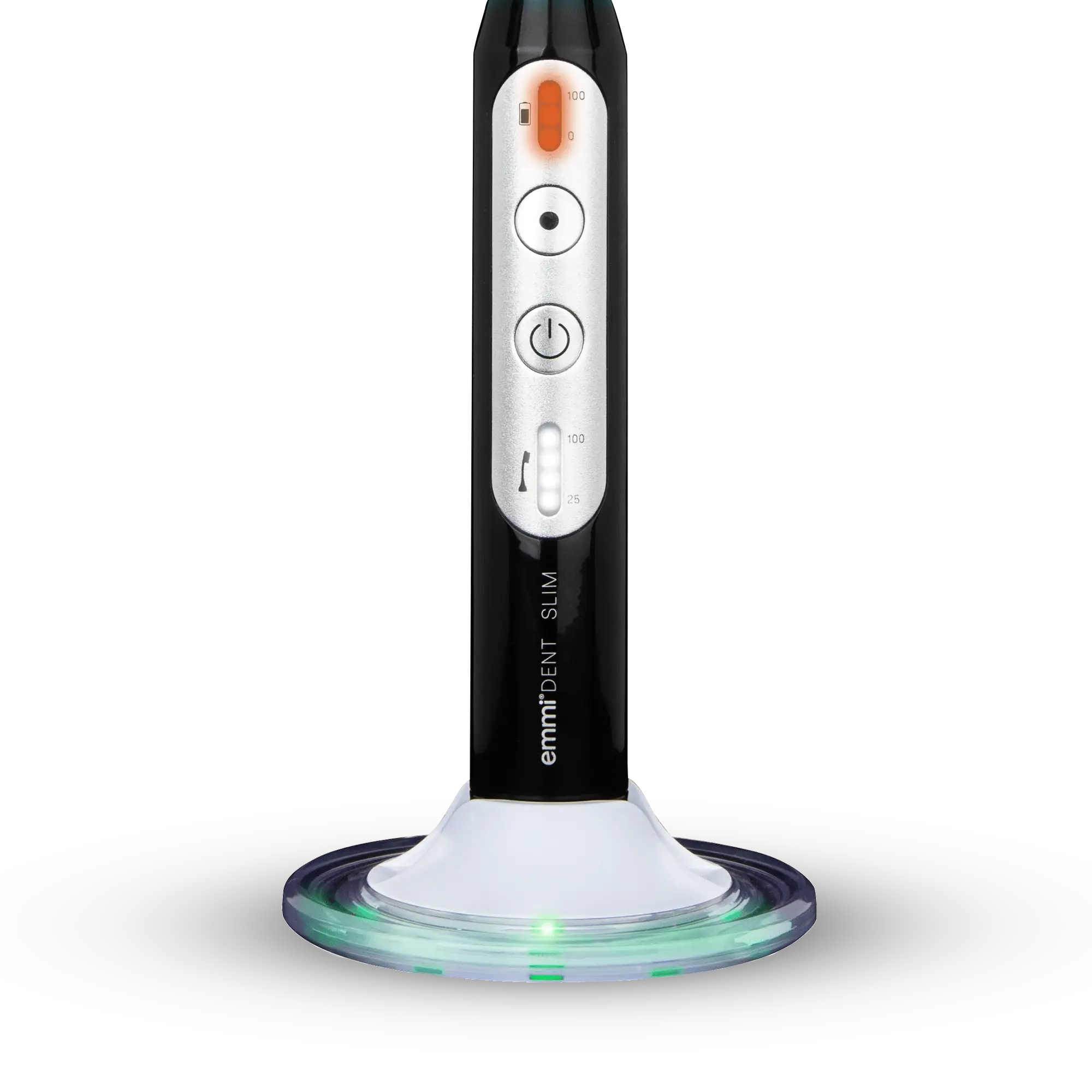 Die emmi-dent Slim reinigt Ihre Zähne mit Ultraschall ganz ohne Schrubben. Das ist besonders schonend für empfindliches Zahnfleisch, Implantate, Zahnspangen oder bei Zahnerkrankungen wie Parodontitis.