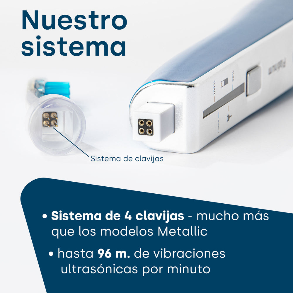 Los modelos Platinum utilizan una sincronización optimizada a través de la integración de un sistema de 4 pines. Esta mejora hace que la tecnología de ultrasonidos sea mucho más efectiva en comparación con los modelos emmi-dent Metallic y Go. La sincronización mejorada permite una acción de limpieza más eficiente y potente, garantizando una eliminación completa de la placa y una buena higiene bucal.