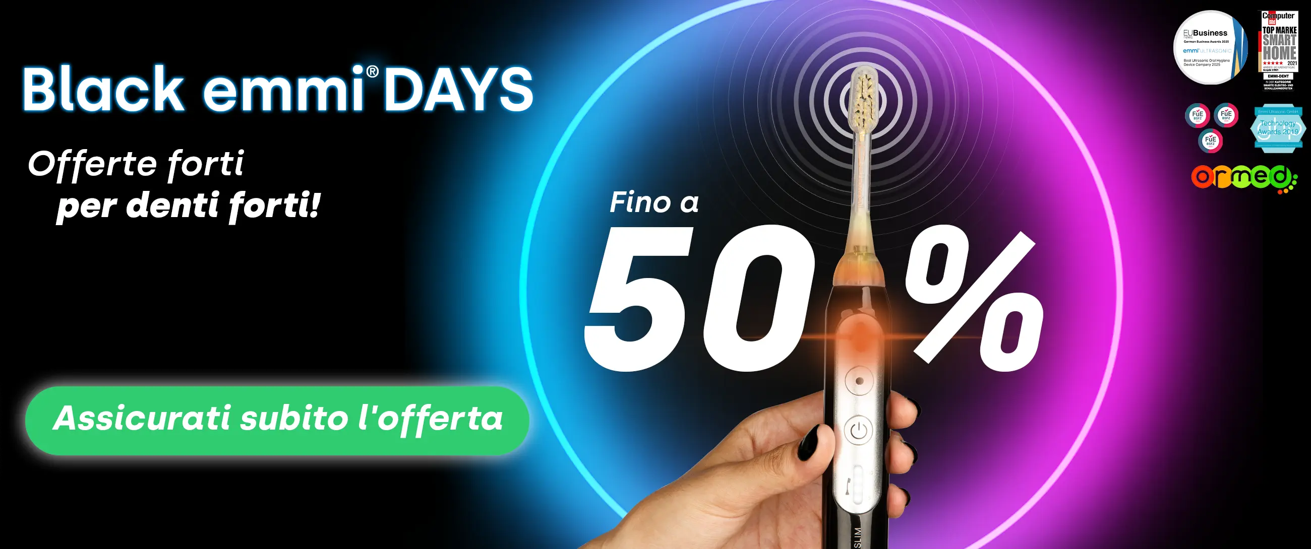 Lo spazzolino a ultrasuoni emmi-dent offre un nuovo principio d'azione con una tecnologia sofisticata, offrendo così il massimo beneficio. I metodi di pulizia convenzionali, come lo spazzolamento con uno spazzolino manuale o elettrico, si basano sulla macro-pulizia. Con movimenti meccanici, l'utente raggiunge dalle 20.000 alle 40.000 vibrazioni al minuto. Al contrario, l'innovativa tecnologia a ultrasuoni praticamente senza contatto di emmi-dent raggiunge fino a 96 milioni di vibrazioni al minuto con questo metodo di micro-pulizia. emmi-dent pulisce in modo professionale e accurato anche le aree difficili da raggiungere della bocca. Le onde ultrasoniche penetrano anche negli spazi più piccoli, anche intorno ad apparecchi ortodontici e impianti. Studi scientifici (Ormed® - Università di Witten/Herdecke) confermano che emmi-dent può essere utilizzato con successo contro placca, parodontite, gengivite (infiammazione delle gengive) e per la terapia di mantenimento parodontale . E tutto questo senza alcun movimento di spazzolamento.