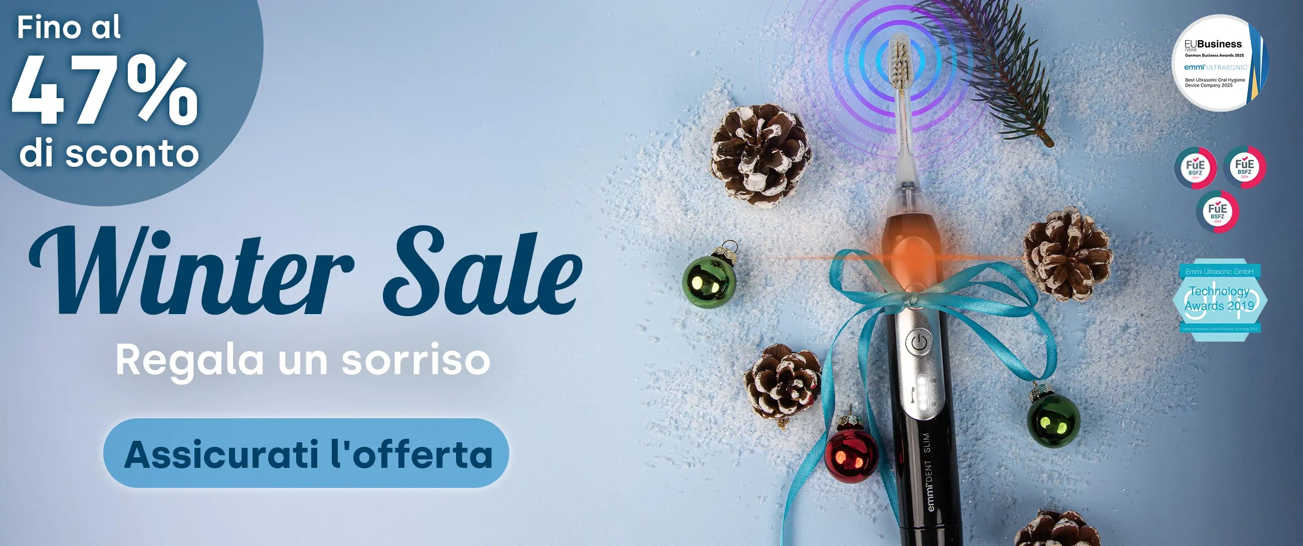 Con lo spazzolino a ultrasuoni Emmi-Dent puoi combattere parodontite, gengivite e afte. La sua efficacia è stata dimostrata in diversi studi . Lavarsi i denti due volte al giorno riduce significativamente il numero di batteri in bocca. Come ulteriore vantaggio, garantisce anche un alito fresco a lungo. Lo spazzolino a ultrasuoni è facile da usare, il che lo rende particolarmente adatto a bambini e persone con difficoltà motorie. Anche chi porta apparecchi ortodontici, ponti, impianti o corone può finalmente tirare un sospiro di sollievo, poiché la tecnologia a ultrasuoni pulisce in modo affidabile anche gli spazi più piccoli. Inoltre, questo spazzolino, utilizzato con uno speciale dentifricio a ultrasuoni , ripristina gradualmente il colore naturale dei denti. Anche le macchie più piccole causate da caffè, tè, vino o nicotina vengono rimosse, restituendoti un sorriso bianco.