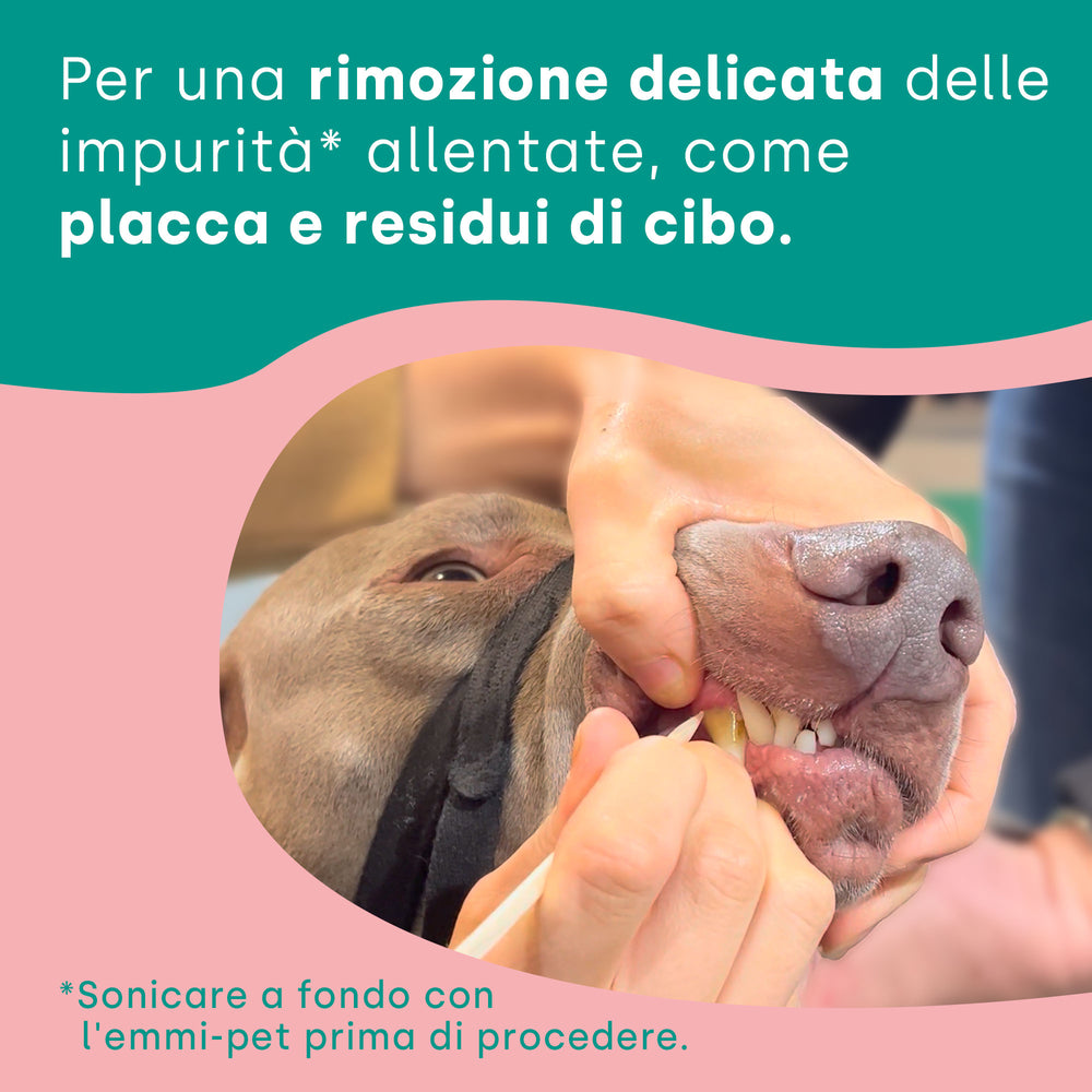 Il set base emmi-pet 2.0 è adatto a tutti i proprietari di animali domestici che hanno a cuore la salute e la cura del loro amico a quattro zampe. Questo set contiene tutto il necessario per rimuovere in modo indolore, delicato e completo la placca e i batteri dal tuo animale domestico.