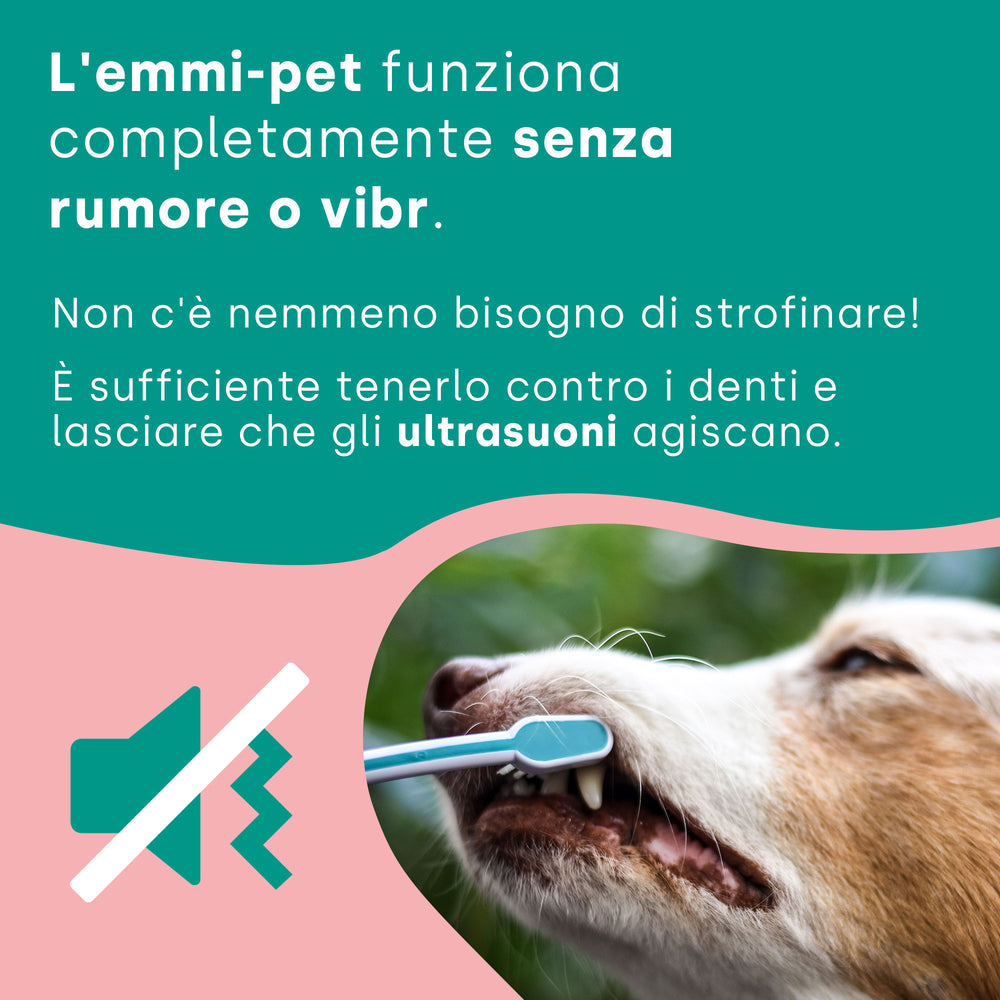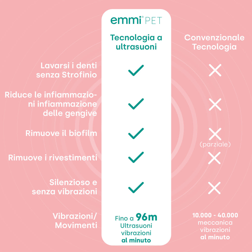 Emmi-pet 2.0 si basa sulla tecnologia brevettata a ultrasuoni (fino a 96 milioni di vibrazioni ultrasoniche al minuto) e, se usato regolarmente, previene efficacemente il tartaro e riduce la placca. L'uso regolare non solo previene la formazione della placca, ma massaggia e rinforza anche le gengive, riducendo l'infiammazione gengivale esistente.