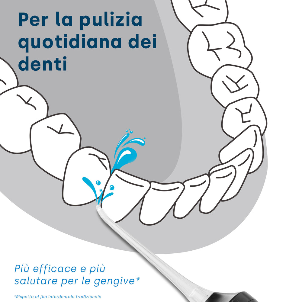 Adatto per la pulizia quotidiana dei denti, più efficace del filo interdentale, più sano per le gengive. Colonna d'acqua pulsata ultra-fine, penetra in profondità negli spazi tra i denti, nelle scanalature e nelle gengive inferiori. Pulisce la superficie dei denti e rimuove i residui di cibo.