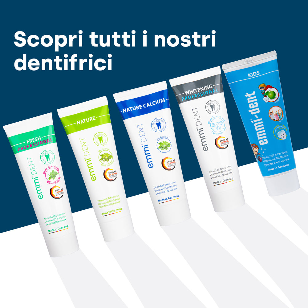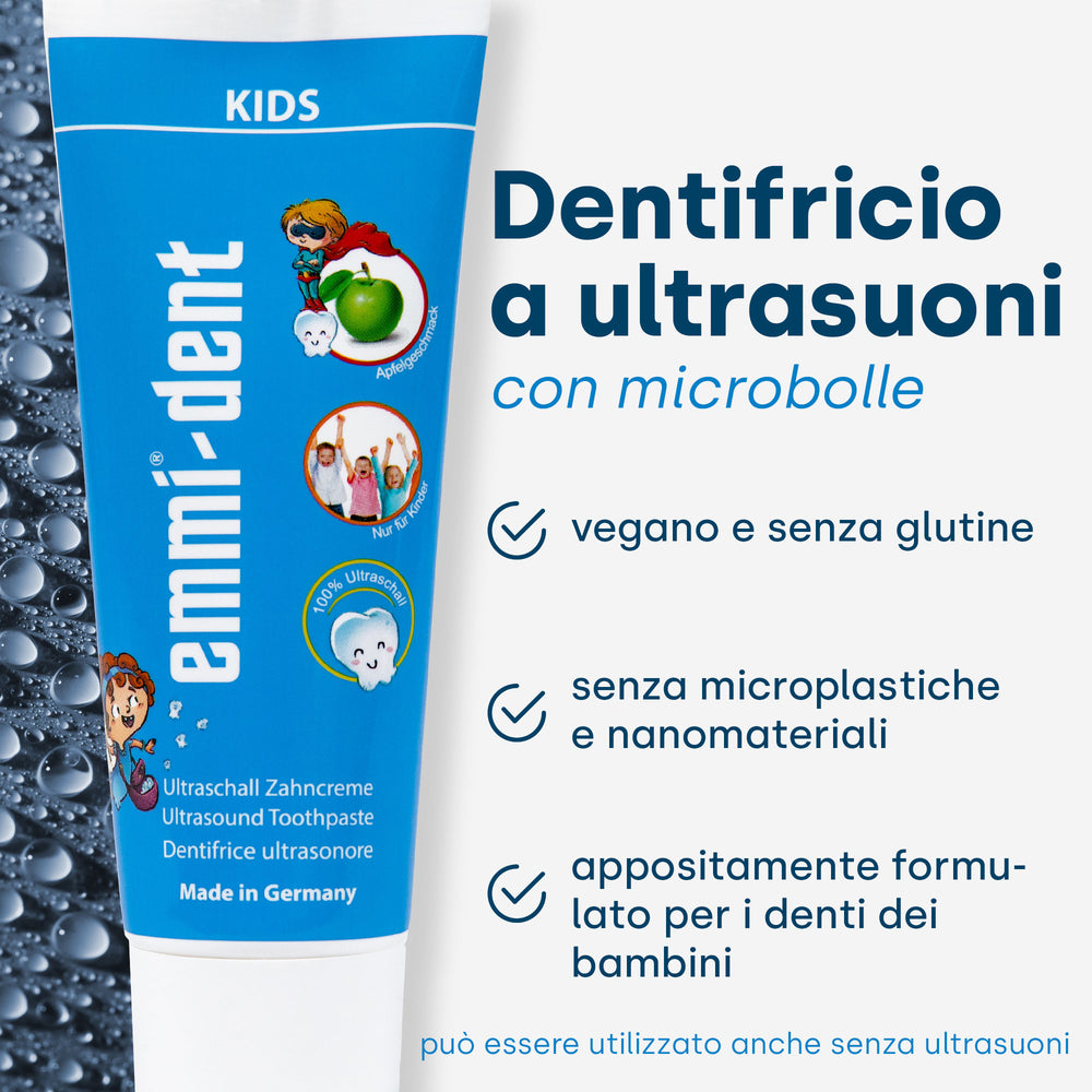 Il dentifricio ultrasonico emmi-dent Kids offre una cura delicata e adatta ai bambini, appositamente studiata per le esigenze dei denti sensibili dei più piccoli. Grazie alla sua formula delicata, pulisce delicatamente e favorisce il mantenimento di una flora orale sana. Goditi la tranquillità di aver scelto la cura migliore per il sorriso radioso del tuo bambino.
