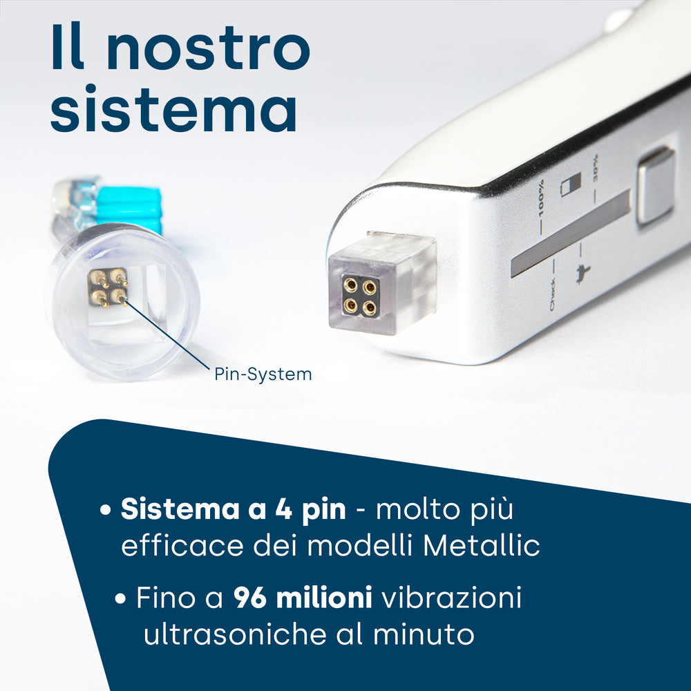 La funzionalità specifica dello spazzolino ad ultrasuoni ne influenza l'utilizzo. Gli spazzolini tradizionali vengono fatti scorrere lungo le file dei denti e sono sempre a contatto con essi. La nostra sofisticata tecnologia a ultrasuoni funziona praticamente senza movimento. Basta muovere delicatamente la testina dello spazzolino sui denti. Oltre allo spazzolino ultrasonico, utilizzare uno speciale dentifricio ultrasonico. 75 millilitri sono sufficienti per circa quattro settimane di utilizzo.