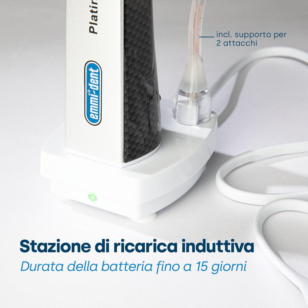 L'emmi-dent Platinum ha una durata della batteria più lunga rispetto ai modelli precedenti. Con un uso regolare 2-3 volte al giorno, il Platinum può durare fino a 15 giorni prima di dover essere ricaricato. Questa batteria a lunga durata (agli ioni di litio) garantisce praticità e utilizzo ininterrotto, eliminando la necessità di ricariche frequenti.