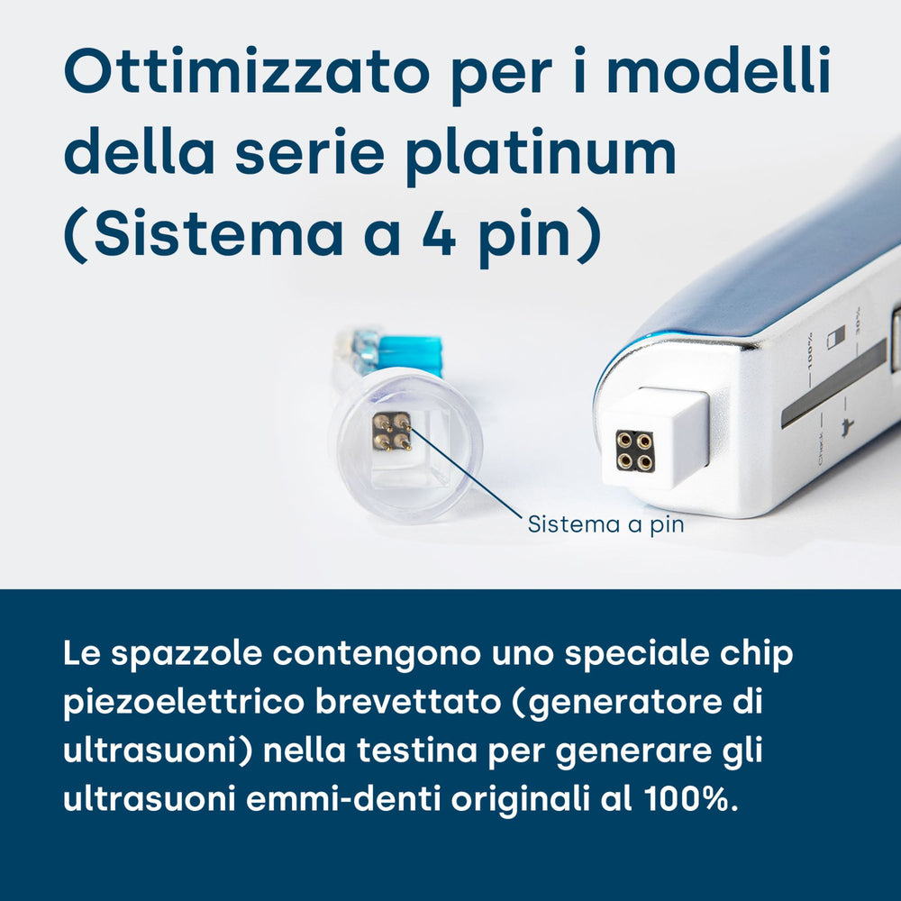 I modelli Platinum utilizzano un clocking ottimizzato tramite l'integrazione di un sistema a 4 pin. Questo miglioramento rende la tecnologia ad ultrasuoni molto più efficace rispetto ai modelli emmi-dent Metallic e Go. La tempistica migliorata consente un'azione pulente più efficace e potente, garantendo una rimozione completa della placca e un'igiene orale ottimale.