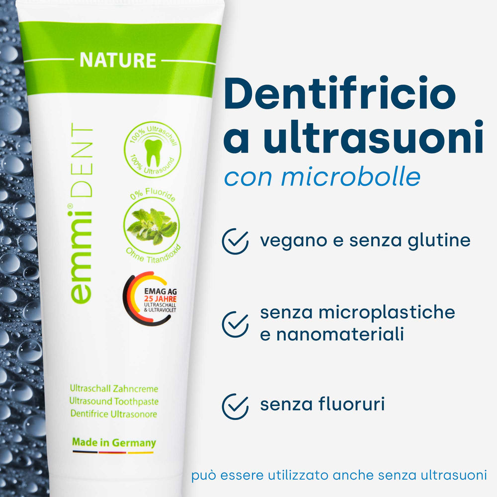 Contrariamente a quanto si pensa, gli spazzolini ad ultrasuoni sono innocui per la salute umana. Ricerche e studi approfonditi hanno dimostrato che l'uso di spazzolini ad ultrasuoni non provoca effetti nocivi o svantaggi per la salute. Gli spazzolini ad ultrasuoni originali, come i nostri modelli emmi-dent, sono appositamente progettati per una pulizia dei denti accurata, delicata e duratura, senza compromettere la salute orale.