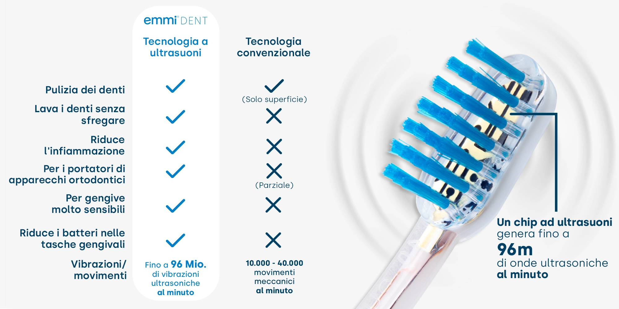 Le testine degli spazzolini ultrasonici emmi-dent contengono il chip piezoelettrico brevettato, che genera fino a 96 milioni di vibrazioni al minuto. Queste vibrazioni, abbinate allo speciale dentifricio ultrasonico emmi-dent, vengono trasmesse direttamente ai denti e nella cavità orale. Qui, minuscole bolle detergenti agiscono riducendo efficacemente batteri, placca e tartaro dentale, contribuendo così a ottenere eccellenti risultati di pulizia.