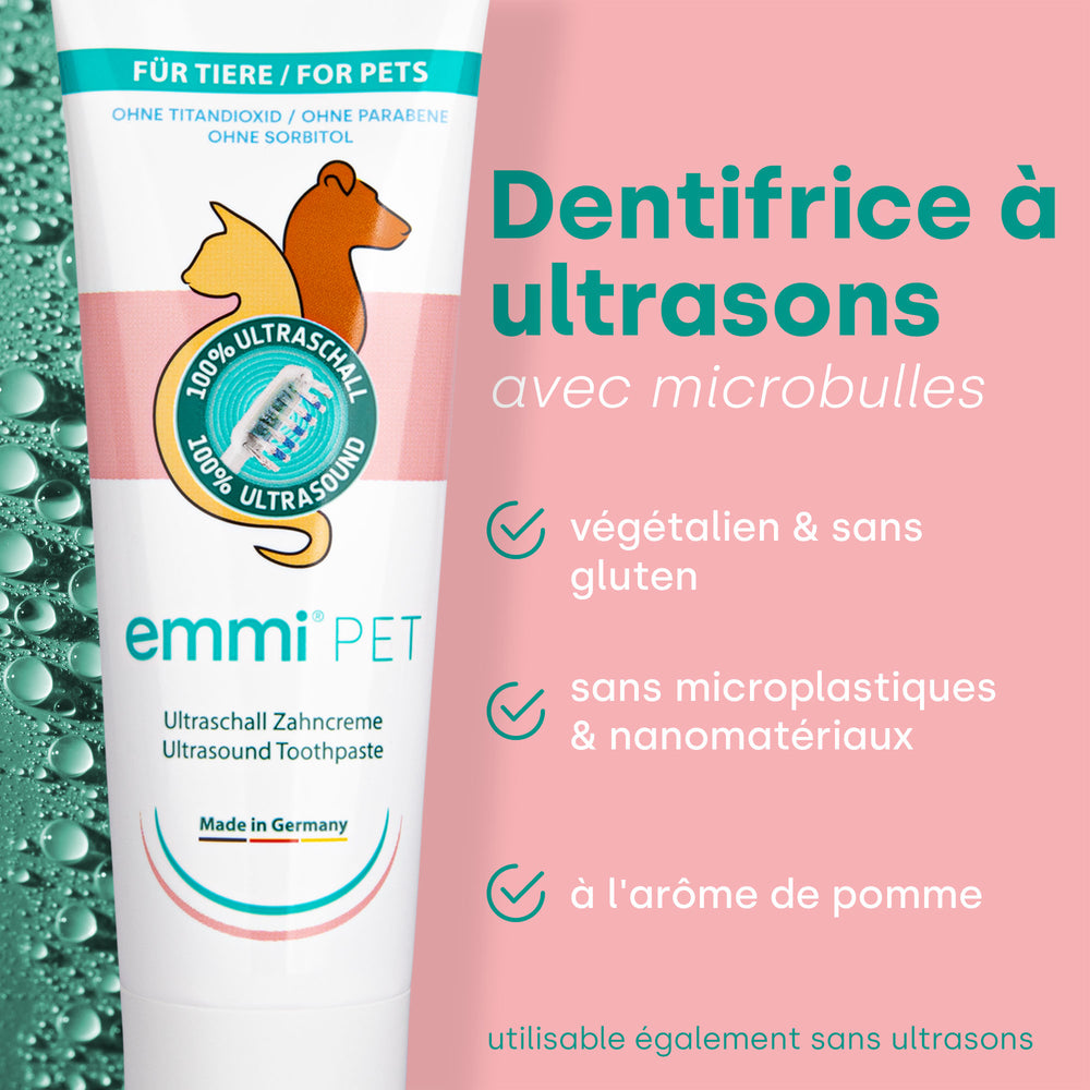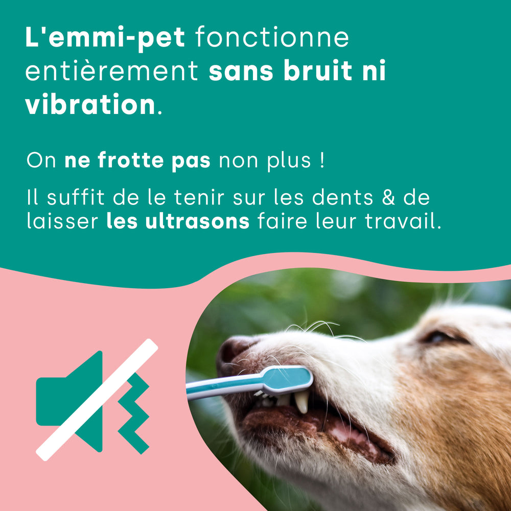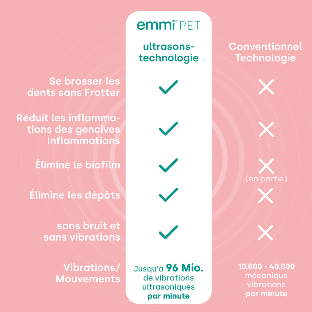 Le kit de base emmi-pet convient à tous les propriétaires d'animaux de compagnie qui se soucient personnellement de la santé et des soins de leur compagnon à quatre pattes. Cet ensemble contient tout ce dont vous avez besoin pour éliminer sans douleur, en douceur et en profondeur la plaque dentaire et les bactéries de votre animal.