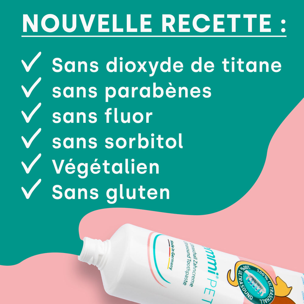 L'offre comprend la brosse à dents à ultrasons emmi-pet ainsi qu'une station de charge, deux têtes de brosse à ultrasons emmi-pet ( 1 x grande / 1 x petite ) et le dentifrice à ultrasons emmi-pet pour animaux .