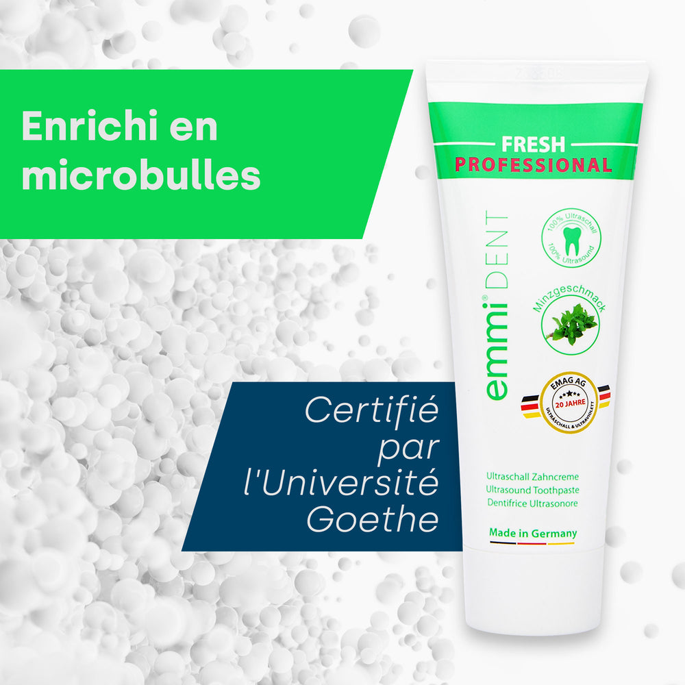 Avec le dentifrice ultrasonique emmi-dent Fresh, vous transformez vos soins dentaires en un rituel rafraîchissant. Profitez d'une fraîcheur longue durée et ressentez la différence en bouche. Commandez maintenant et vivez une expérience de nettoyage incomparable qui vous ravira.