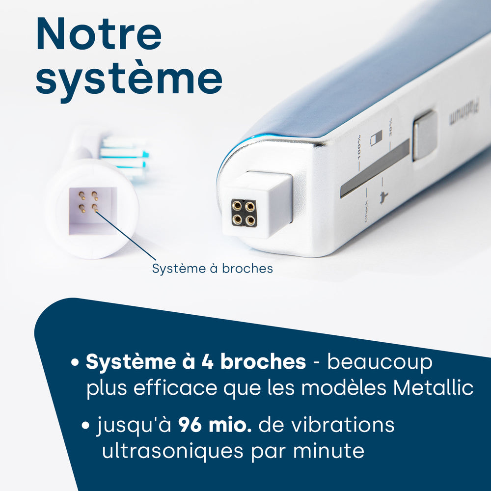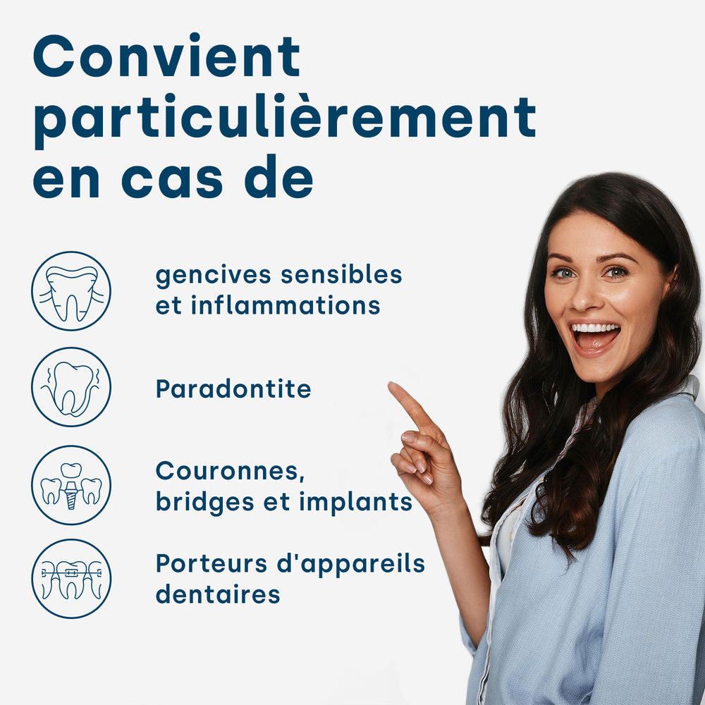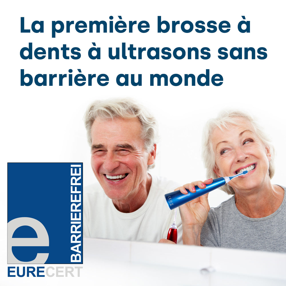 Les brosses à dents fonctionnant aux ultrasons révolutionnent le brossage des dents depuis 2013. L'avantage décisif par rapport aux brosses à dents manuelles classiques ou aux brosses à dents électriques est que les brosses à dents à ultrasons fonctionnent presque sans contact et sans mouvements mécaniques. Cela rend le nettoyage particulièrement doux et pourtant fiable et approfondi.