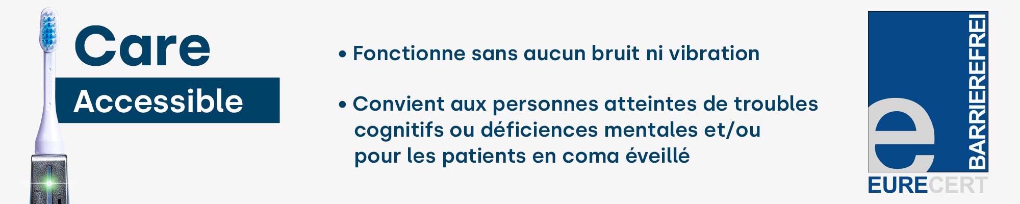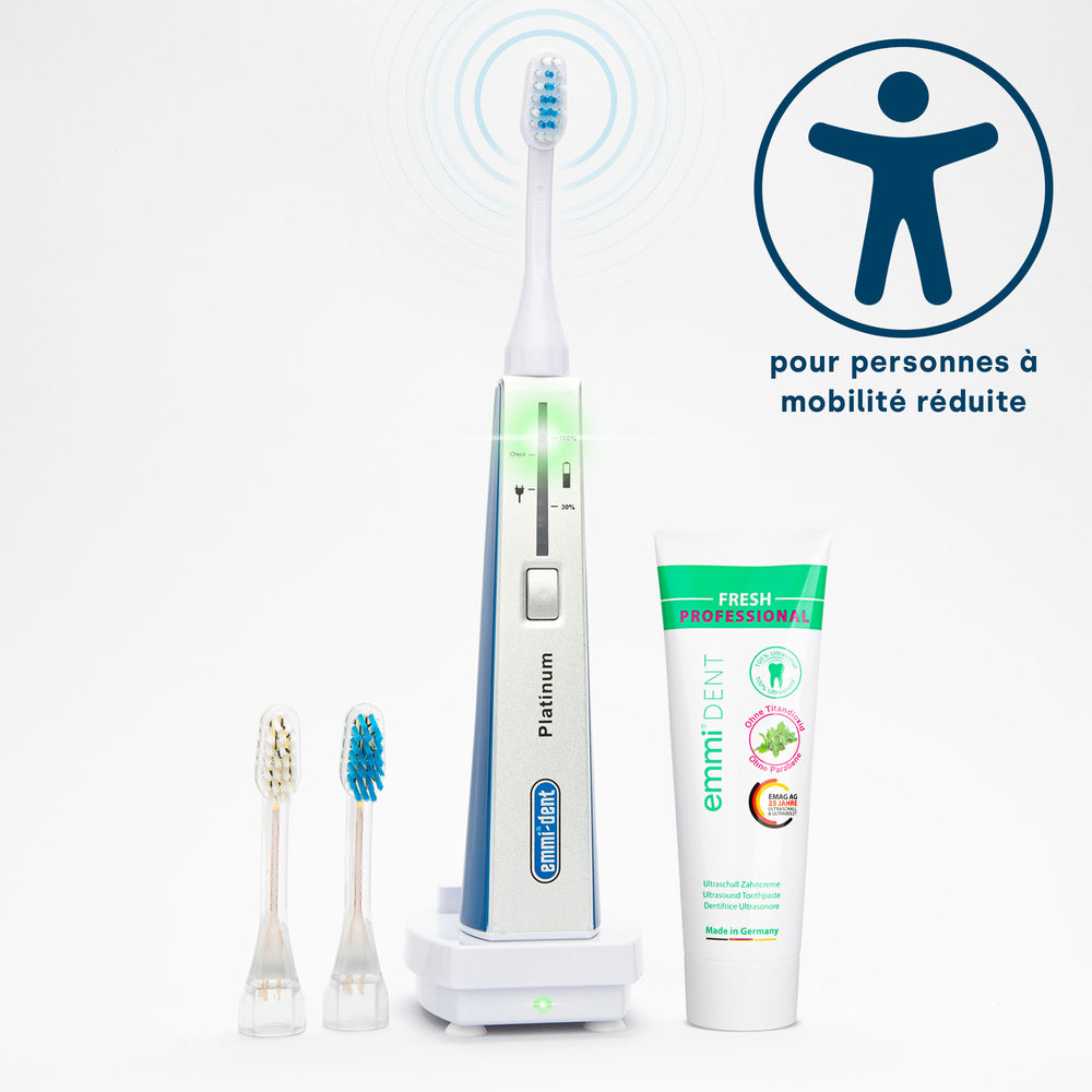 La santé commence dans la bouche. Avec notre gamme emmi-dent Platinum Care, nous révolutionnons les soins dentaires quotidiens des personnes handicapées ou à mobilité réduite . Une hygiène bucco-dentaire qui convainc non seulement en termes de minutie, mais aussi en termes de simplicité, d’accessibilité et de gain de temps pour les tiers soignants. Notre brosse à dents à ultrasons Platinum Care représente la dernière technologie à ultrasons.