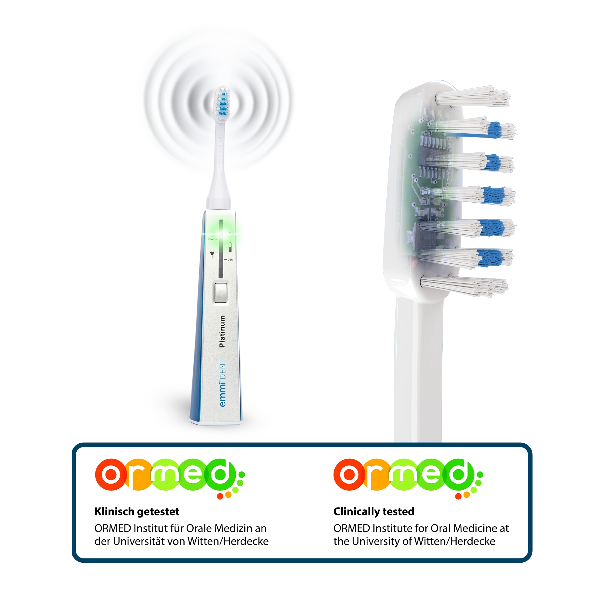 La fonctionnalité de nos brosses à dents à ultrasons emmi-dent a été testée dans une étude clinique menée par l'Université de Witten/Herdecke . Le professeur Dr.hcP Gängler, directeur général de l'institut de médecine bucco-dentaire, évalue le test de nos brosses à dents à ultrasons emmi-dent avec les mots suivants : « Le nettoyage des dents à l'aide d'ultrasons et sans mouvement de brossage élimine en toute sécurité et en profondeur la plaque dentaire et le biofilm. Grâce à cette technologie, les dommages causés par le brossage au niveau des collets dentaires, des gencives et des dents peuvent être évités. Brosse à dents particulièrement adaptée aux personnes ayant des dents sensibles. L'application sans abrasion garantit que les blessures aux gencives peuvent être activement évitées. De plus, une utilisation régulière favorise activement la réduction de la gingivite.
