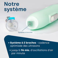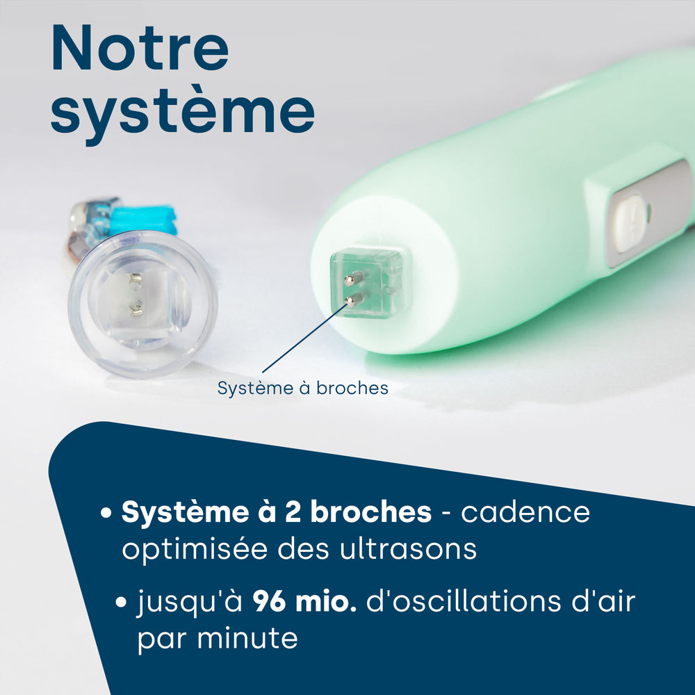 Les brosses à dents fonctionnant aux ultrasons révolutionnent le brossage des dents depuis 2013. L'avantage décisif par rapport aux brosses à dents manuelles classiques ou aux brosses à dents électriques est que les brosses à dents à ultrasons fonctionnent presque sans contact et sans mouvements mécaniques. Cela rend le nettoyage particulièrement doux et pourtant fiable et approfondi.